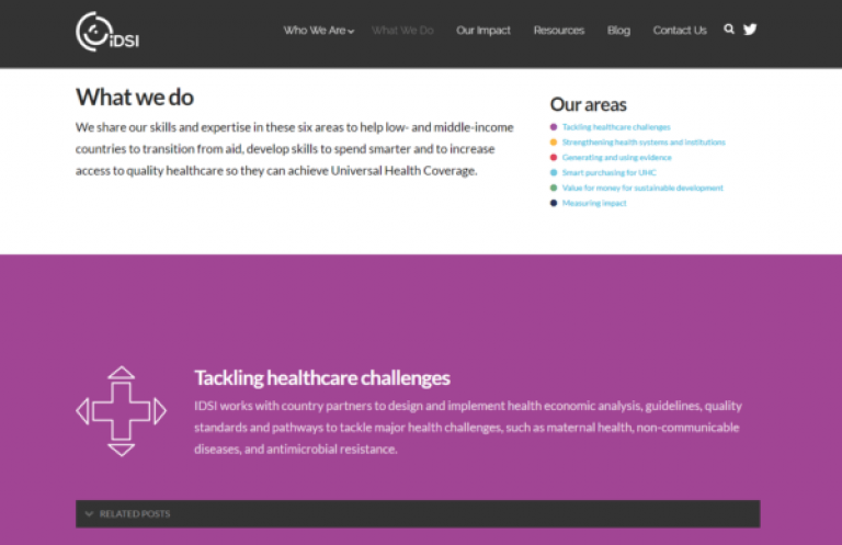 The six key themes are introduced under the ‘What we do’ section of the site, with a summary introducing the theme. Related posts are displayed under a drop-down box.