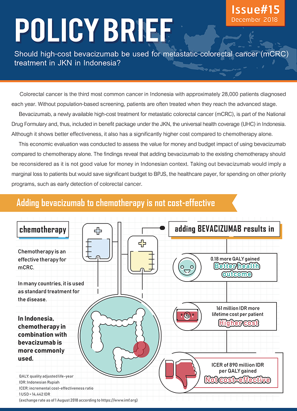 Bevacizumab, a newly available high-cost treatment for metastatic colorectal cancer (mCRC), is part of the National Drug Formulary and, thus, included in benefit package under the JKN, the universal health coverage (UHC) in Indonesia. Although it shows better effectiveness, it also has a significantly higher cost compared to chemotherapy alone.
