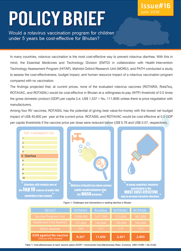 The findings projected that, at current prices, none of the evaluated rotavirus vaccines (ROTARIX, RotaTeq, ROTAVAC, and ROTASIIL) would be cost-effective in Bhutan at a willingness-to-pay (WTP) threshold of 0.5 times the gross domestic product (GDP) per capita (i.e. US$ 1,537 = Nu. 111,908) unless there is price negotiation with manufacturers.