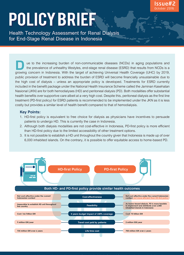 Due to the increasing burden of non-communicable diseases (NCDs) in aging populations and the prevalence of unhealthy lifestyles, end-stage renal disease (ESRD) that results from NCDs is a growing concern in Indonesia. With the target of achieving Universal Health Coverage (UHC) by 2019, public provision of treatment to address the burden of ESRD will become financially unsustainable due to the high cost of dialysis – unless an appropriate policy is developed. Treatments for ESRD currently included in the benefit package under the National Health Insurance Scheme called the Jaminan Kasehatan Nasional (JKN) are for both hemodialyses (HD) and peritoneal dialysis (PD). Both modalities offer substantial health benefits over supportive care albeit at a very high cost. Despite this, peritoneal dialysis as the first line treatment (PD-first policy) for ESRD patients is recommended to be implemented under the JKN as it is less costly but provides a similar level of health benefit compared to that of hemodialysis.