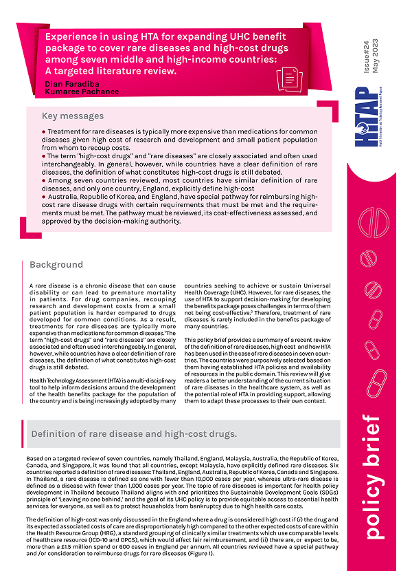 This policy brief provides a summary of a recent review of the definition of rare diseases, high cost and how HTA has been used in the case of rare diseases in seven countries. The countries were purposively selected based on them having established HTA policies and availability of resources in the public domain. This review will give readers a better understanding of the current situation of rare diseases in the healthcare system, as well as the potential role of HTA.