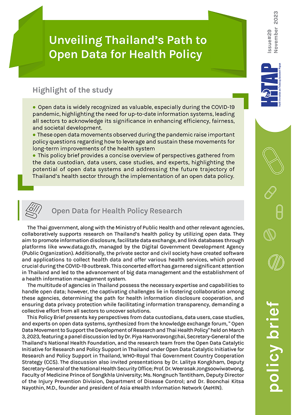 This policy brief provides a concise overview of perspectives gathered from the data custodian, data users, case studies, and experts, highlighting the potential of open data systems and addressing the future trajectory of Thailand’s health sector through the implementation of an open data policy.