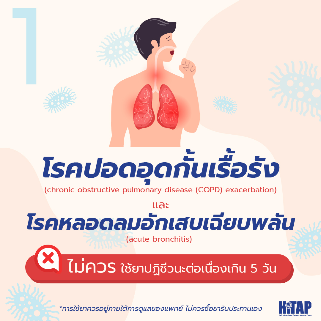 1. แพทย์ไม่ควรใช้ยาปฏิชีวนะต่อเนื่องเกิน 5 วัน ในผู้ป่วยที่มีการกำเริบของโรคปอดอุดกั้นเรื้อรัง (chronic obstructive pulmonary disease (COPD) exacerbation) และผู้ป่วยโรคหลอดลมอักเสบเฉียบพลัน (acute bronchitis) ที่มีอาการที่ชี้ว่าอาจมีการติดเชื้อแบคทีเรีย ได้แก่ พบเสมหะสีเขียวเหลืองเพิ่มขึ้นร่วมกับอาการหายใจลำบากเพิ่มขึ้น และ/หรือมีปริมาณเสมหะมากขึ้น