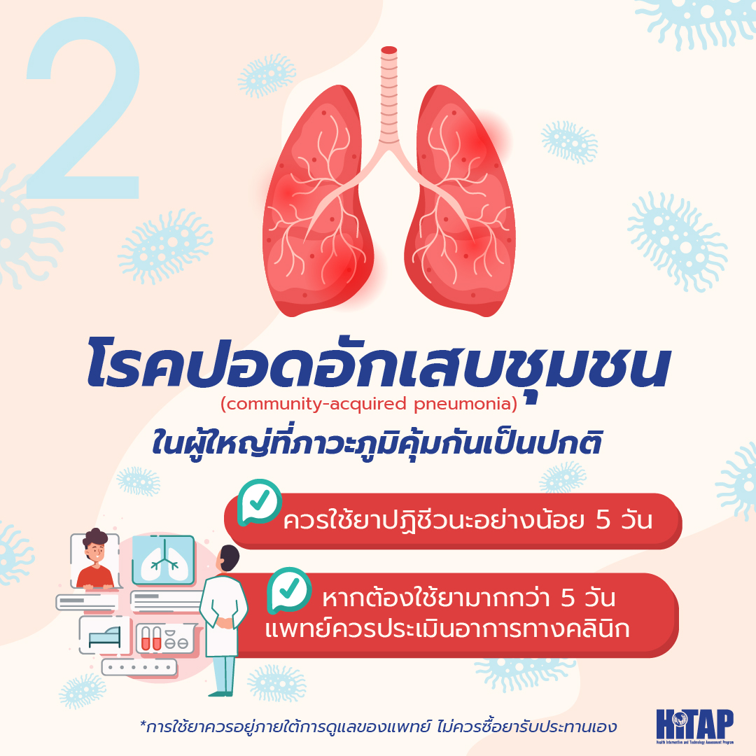 2. ในโรคปอดอักเสบชุมชน (community-acquired pneumonia) ในผู้ใหญ่ที่ภาวะภูมิคุ้มกันเป็นปกติ ควรใช้ยาปฏิชีวนะอย่างน้อย 5 วัน หากต้องใช้ยาปฏิชีวนะมากกว่า 5 วัน แพทย์ควรประเมินว่าอาการทางคลินิกทรงตัวหรือไม่ โดยประเมินการกลับมาเป็นปกติของสัญญาณชีพที่เคยผิดปกติ ความสามารถในการรับประทานอาหาร และการรู้สึกตัวเป็นปกติ