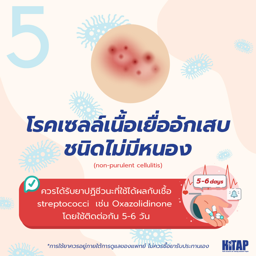 5. โรคเซลล์เนื้อเยื่ออักเสบชนิดไม่มีหนอง (non-purulent cellulitis) ควรได้รับยาปฏิชีวนะที่ใช้ได้ผลกับเชื้อ streptococci เช่น ยาที่มีส่วนผสมของ Oxazolidinone เป็นต้น โดยใช้ยาติดต่อกัน 5-6 วัน โดยเฉพาะในผู้ป่วยสามารถสำรวจอาการตัวเองได้ และมีการตรวจติดตามใกล้ชิดในสถานพยาบาลระดับปฐมภูมิ
