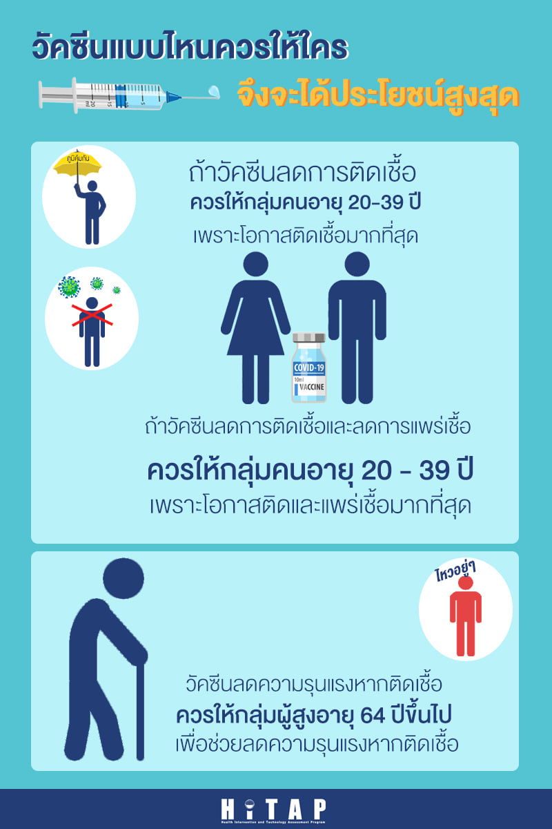 2.1 หากวัคซีนให้ผลทั้ง 3 แบบ พบว่า “กลุ่มคนอายุ 20 – 39 ปี” ควรได้รับวัคซีนเป็นกลุ่มแรก เพราะเป็นกลุ่มคนที่ติดเชื้อมากที่สุดในประเทศไทย เนื่องจากต้องเดินทางออกจากที่อยู่อาศัย พบเจอผู้คนมาก จึงมีโอกาสติดเชื้อและแพร่เชื้อสูง ทั้งสู่คนที่พบเจอ และคนที่อยู่ในบ้านหรือที่พักเดียวกัน
