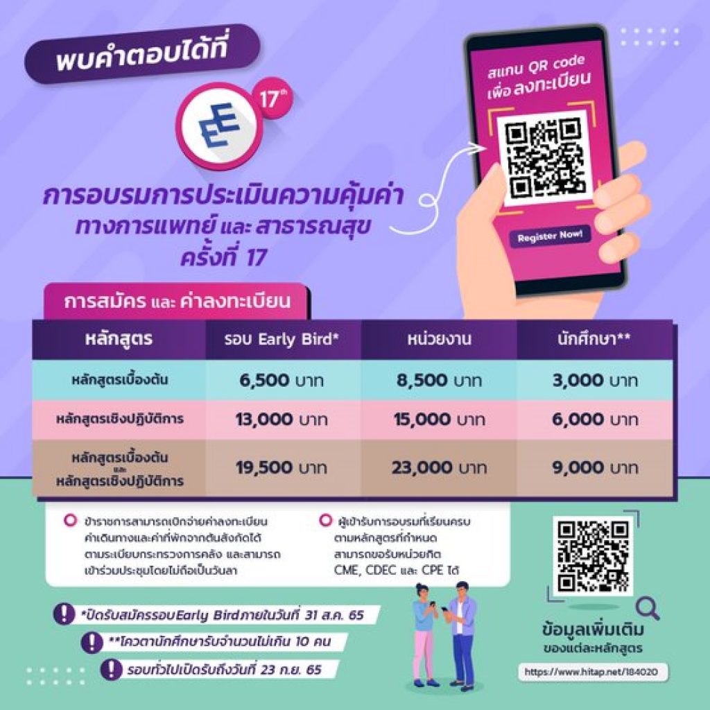 ข้อสงสัยทั้งประเด็นยาราคาแพงและเพดานความคุ้มค่า สามารถหาคำตอบพร้อมวิธีที่จะช่วยให้ทุกคนเข้าใจภาพรวมและหนทางที่เราจะร่วมแก้ปัญหาไปด้วยกันในการอบรมการประเมินความคุ้มค่าทางการแพทย์และสาธารณสุข ครั้งที่ 17 วันที่ 31 ตุลาคม – 4 พฤศจิกายน 2565