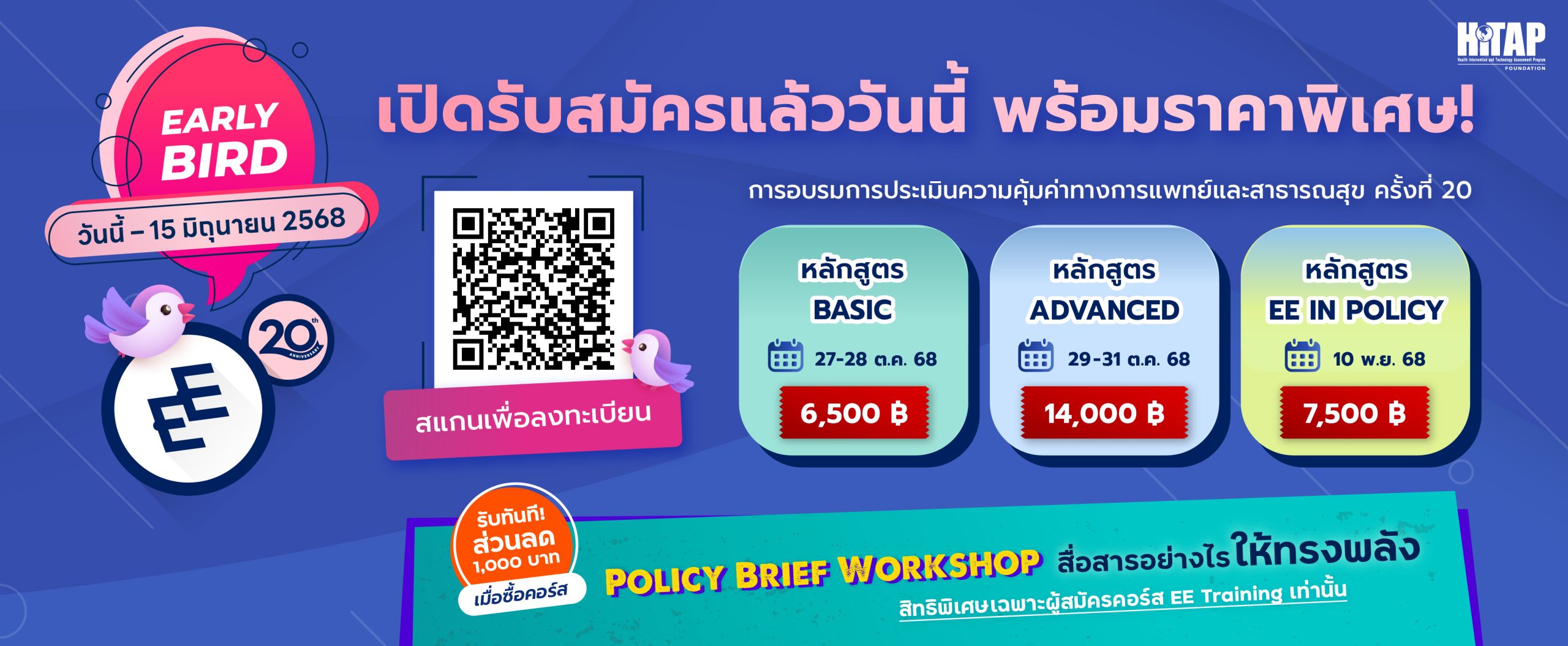 กลับมาอีกครั้งกับการอบรมการประเมินความคุ้มค่าทางการแพทย์และสาธารณสุข หรือที่คุ้นหูกันในชื่อ “การอบรม EE” ซึ่งทาง HITAP ได้จัดต่อเนื่องมาแล้ว 19 ปี ปีนี้ถือเป็นการครบรอบสองทศวรรษ และในปีนี้ EE20 มาพร้อมกับ 3 หลักสูตรที่ออกแบบมาให้ตอบโจทย์ในทุกระดับตามความเชี่ยวชาญและความสนใจ เพื่อสร้างความรู้ความเข้าใจในการประเมินความคุ้มค่าฯ และนำไปต่อยอดสู่การใช้งานจริง ดังนี้
