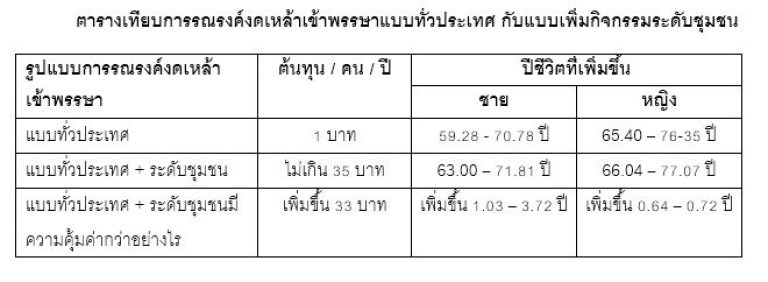 รายงานวิจัย “การพัฒนาแบบจำลองการประเมินความคุ้มค่าทางเศรษฐศาสตร์ของมาตรการสร้างเสริมสุขภาพในประเทศไทย : กรณีศึกษามาตรการควบคุมการบริโภคเครื่องดื่มแอลกอฮอล์” จะช่วยปอกเปลือกประเมินแคมเปญนี้ให้รู้ว่าการจัดกิจกรรมงดเหล้าเข้าพรรษาในชุมชนเพื่อขยายผลจากการรณรงค์ในระดับประเทศเพียงอย่างเดียวคุ้มหรือไม่ ?