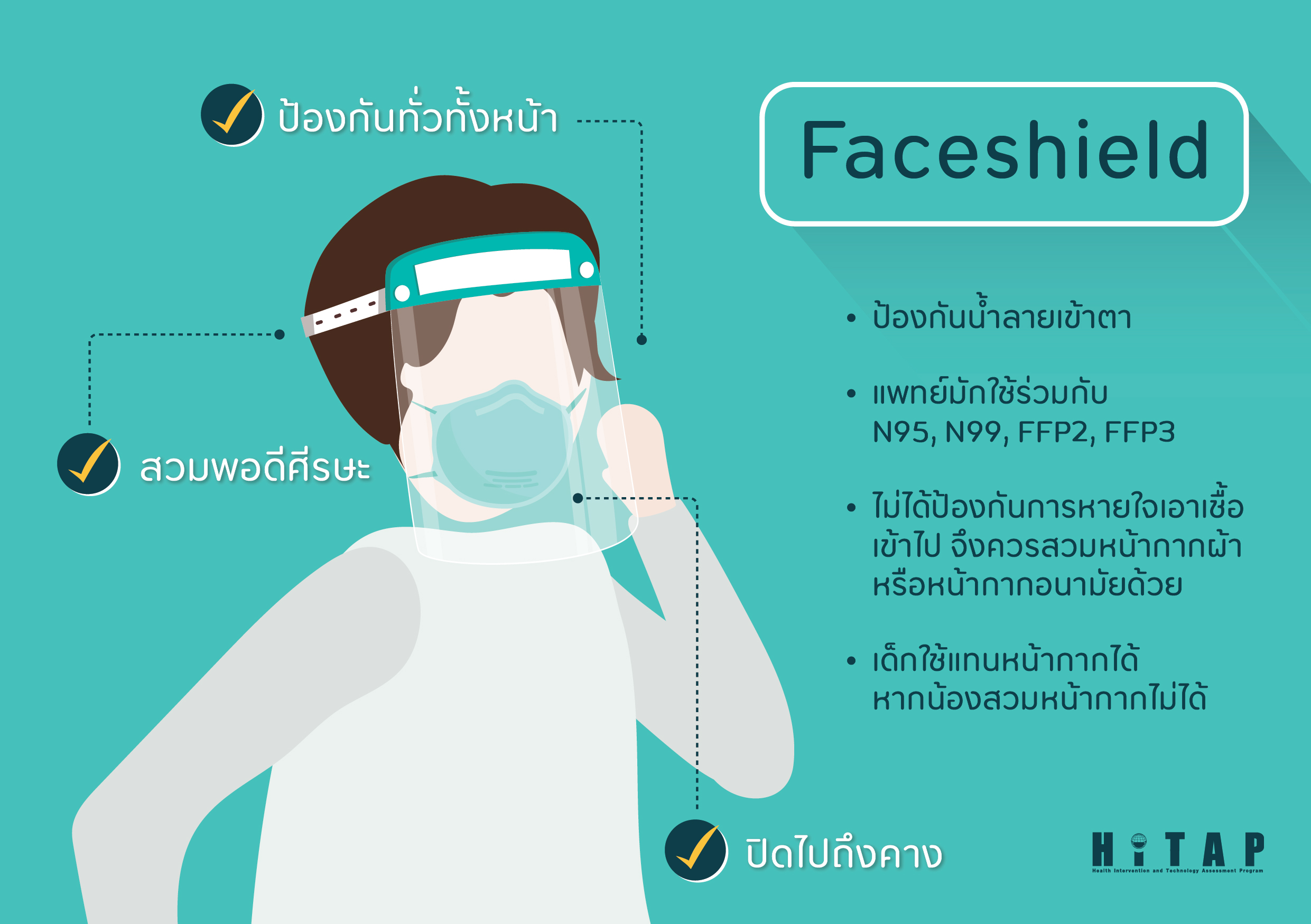 หน้ากากป้องกันใบหน้าหรือที่เรียกกันติดปากว่า เฟซชิลด์ (Face shield) โดยปกติจะมีไว้สำหรับให้แพทย์ใช้เพื่อป้องกันดวงตาครับ โดยเฉพาะแพทย์ที่จำต้องเสี่ยงพบกับน้ำลายของผู้ป่วยเยอะ ๆ เช่น ทันตแพทย์ แพทย์ที่ทำ AGP เป็นต้น โดยจะสวมร่วมกับหน้ากากอนามัยหรือหน้ากากชนิด N95, N99, FFP2 หรือ FFP3