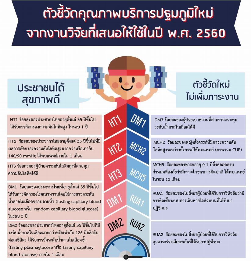จากการศึกษาดังกล่าว เพิ่มมิให้เพิ่มภาระงานภาระงานบริการแก่ผู้ปฏิบัตงานในพื้นที่ จึงได้เสนอให้มีตัวชี้วัด 3 กลุ่ม ได้แก่ตัวชี้วัดฯกลาง ซึ่งใช้กับหน่วยบริการทุกแห่ง  2 ตัวชี้วัดฯพื้นที่ ซึ่งหน่วยบริการแต่ละเขตสามารถเลือกนำไปใช้ได้ตสมความเหมาะสมกับบริบทของพื้นที่และ  3 ตัวชี้วัดฯ ที่พีื้นที่คณะอนุกรรมการหลักประกันสุขภาพเขต(อปสข.) พัฒนาเพิ่มเติมตามปัญหาและบริบทของพื้นที่  การคัดเลือกตัวชี้วัดฯ ในปี 2560จึงได้ออกแบบกระบวนการที่มีคุณลักษณะคล้ายกับสหราชอาณาจักร ตัวชี้วัดเหล่านี้ได้รับการพัฒนาให้ตอบโจทย์ในการดูแลสุขภาพประชาชน ช่วยลดความสูญเสียทางเศรษฐกิจจากการเจ็บป่วย การเสียชีวิตก่อนวัยอันควรและลดค่าใช้จ่ายด้านสุขภาพของภาครัฐจากการให้บริการที่มีคุณภาพและมาตรฐาน ตัวชี้วัดเหล่านี้ ได้แก่ HT = โรคความดันโลหิต (hypertension) HT1 HT2 HT3 MCH = อนามัยแม่และเด็ก (maternal and child health) MCH2 MCH5 RUA = การใช้ยาปฏิชีวะอย่างสมเหตุสมผล (rational use of antibiotics) RUA1 RUA2 และ DM = โรคเบาหวาน (diabetes mellitus) DM1 DM2 ตัวชี้วัดฯ ดังกล่าวได้รับการยอมรับจากผู้ให้บริการมากกว่าร้อยละ 70 รวมทั้งมีการให้บริการในหน่วยบริการปฐมภูมิทุกขนาด และมีการบันทึกข้อมูลในฐานข้อมูล 43 แฟ้ม