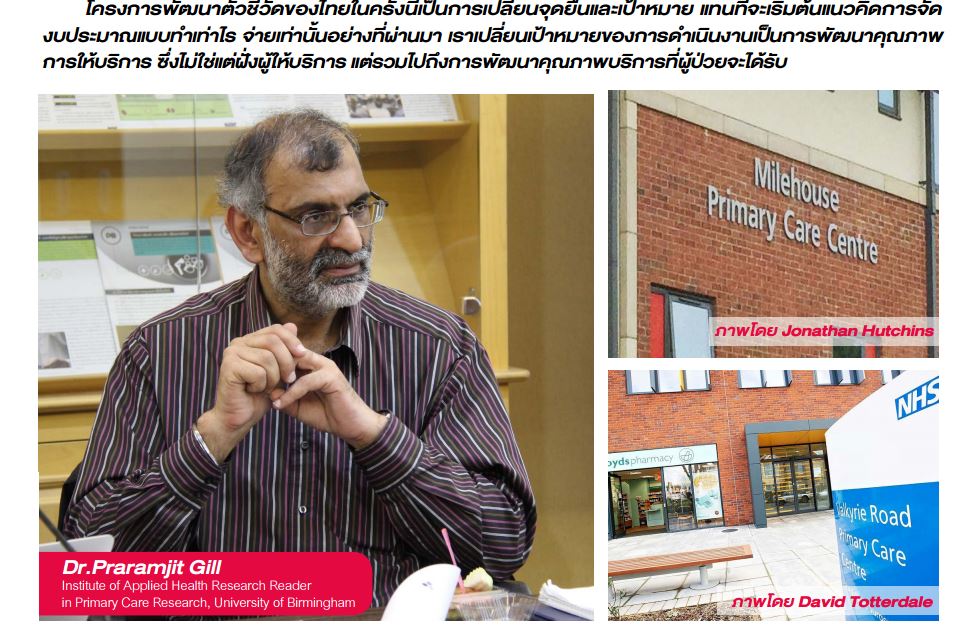 Dr. Praramjit Gill: หากประเทศไทยต้องการพัฒนาเรื่องนี้ สิ่งแรกที่ต้องคำนึง คือการวางระบบและการให้ความสำคัญของบริการปฐมภูมิ โดยบริการปฐมภูมิไม่ได้หมายถึงแพทย์อย่างเดียว แต่หมายถึงทีมบริการปฐมภูมิที่รวมถึงพยาบาล เภสัชกร และเจ้าหน้าที่สาธารณสุขที่เกี่ยวข้อง ที่ต้องทำงานร่วมกัน ปัจจุบันประเทศไทยยังมีปัญหาเรื่องแนวคิดเหมือนกับที่สหราชอาณาจักรประสบเมื่อ 30 ปีที่แล้ว คือ คนมองว่าโรงพยาบาลขนาดใหญ่ดีที่สุด ส่วนสถานพยาบาลปฐมภูมิถูกมองว่าด้อยคุณภาพ การแก้ปัญหาดังกล่าวต้องอาศัยการวางระบบให้เกิดสมดุลของการให้บริการในระดับต่าง ๆ ซึ่งต้องใช้เวลาในการดำเนินการ เราโชคดีที่ผ่านกระบวนการการพัฒนาระบบบริการปฐมภูมิมาแล้ว ประเทศไทยกำลังก้าวผ่านจุดนี้ไป ผมมั่นใจว่าต้องดีขึ้น เพราะการพัฒนาตัวชี้วัดในครั้งนี้เป็นการเปลี่ยนจุดยืนและเป้าหมาย แทนที่จะเริ่มต้นแนวคิดการจัดงบประมาณแบบทำเท่าไร จ่ายเท่านั้นอย่างที่ผ่านมา เราเปลี่ยนเป้าหมายของการดำเนินงานเป็นการพัฒนาคุณภาพการให้บริการ ซึ่งไม่ใช่แต่ฝั่งผู้ให้บริการ แต่รวมไปถึงการพัฒนาคุณภาพบริการที่ผู้ป่วยจะได้รับ ประเทศไทย เป็นประเทศลำดับต้น ๆ ในประเทศกำลังพัฒนาที่เริ่มพัฒนาระบบตัวชี้วัดคุณภาพ ซึ่งจะสามารถเป็นต้นแบบและแลกเปลี่ยนประสบการณ์ให้กับประเทศที่มีความคล้ายคลึงกัน ซึ่งน่าจะดีกว่าการนำข้อมูลจากประเทศพัฒนาแล้วมาใช้