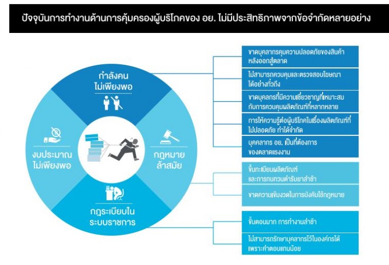 อย. เป็นหน่วยงานที่ก่อตั้งมานานกว่า 40 ปี มีหน้าที่ตรวจสอบและขึ้นทะเบียน 8 ผลิตภัณฑ์ ได้แก่ 1. ยา 2.ยาเสพติด 3. สารระเหย 4. เครื่องมือแพทย์ 5. อาหาร 6. เครื่องสำอาง 7. วัตถุอันตราย 8. การควบคุมการโฆษณาและการส่งเสริมการขาย ทว่าในอดีตผลิตภัณฑ์ที่มายื่นขอขึ้นทะเบียนยังมีน้อย อีกทั้งผลิตภัณฑ์ ยา อาหาร เครื่องสำอาง ก็มีเอกสารที่ต้องทบทวนในการพิจารณาไม่ยากนักเมื่อเทียบกับปัจจุบันที่มีจำนวนผู้มายื่นขอจดทะเบียนเพิ่มมากขึ้นหลายเท่าตัว เจ้าหน้าที่ทำงานไม่ทันและไม่สามารถจ้างผู้เชี่ยวชาญจากแหล่งต่าง ๆ มาประเมินผลิตภัณฑ์ได้ จึงเกิดเป็นปัญหาติดล็อกของ อย. นายแพทย์วันชัย สัตยาวุฒิพงศ์ เลขาธิการอย. กล่าวว่า “ ปัญหาดังกล่าวเหมือนคอขวด 3 ประการ ว่าด้วย อัตรากำลังคนไม่พอ อัตราค่าตอบแทนไม่สูงพอ และแหล่งเงินที่ใช้มีไม่เพียงพอ ทำให้ให้ผู้ประกอบการและผู้บริโภคเดือดร้อน เพราะ อย. ทำงานช้าในกระบวนการพิจารณาใบอนุญาต อีกทั้งกระบวนการพิจารณาต้องอาศัยเกณฑ์และการรับรองจากผู้เชี่ยวชาญในการยืนยันว่า ผลิตภัณฑ์มีคุณภาพ มีความปลอดภัยต่อผู้บริโภคก่อน จึงไม่สามารถออกใบอนุญาตให้รวดเร็วตามความต้องการของผู้ประกอบการได้ทุกรายทันเวลา”