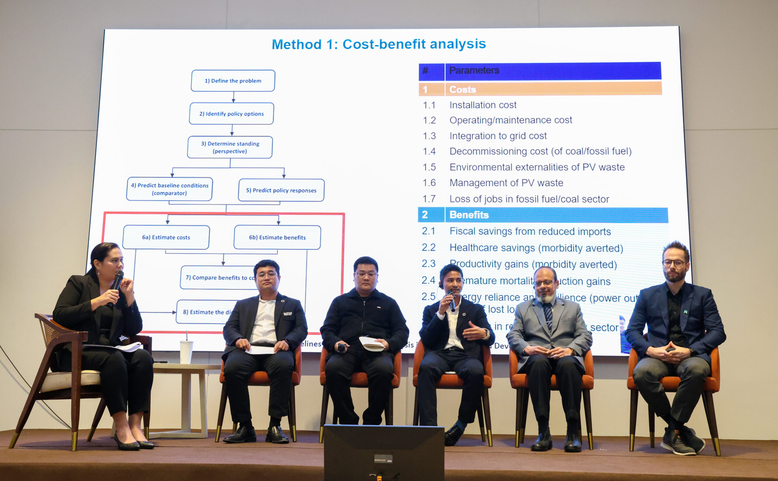 ดร. นพ.ยศ ตีระวัฒนานนท์ ผู้ช่วยเลขาธิการมูลนิธิและนักวิจัยอาวุโส HITAP ได้กล่าวถึงวิสัยทัศน์ของโครงการและชี้ให้เห็นถึงความสำคัญของการเสวนา ที่ไม่ใช่เพียงเรื่องของเทคโนโลยี แต่คือการสร้างสมดุลระหว่างผลประโยชน์ร่วม (co-benefits) และการป้องกันความเสี่ยงแฝง ผ่านความร่วมมือระหว่างภาครัฐ เอกชน และชุมชน มุ่งสู่เป้าหมายการปล่อยก๊าซเรือนกระจกสุทธิเป็นศูนย์ (net zero) ของประเทศไทยในปี พ.ศ.2593 โดยมีกรอบการวิจัยครอบคลุม 5 ด้าน ได้แก่ การลดการปล่อยมลพิษ ผลกระทบต่อสุขภาพ ต้นทุนทางเศรษฐกิจ การจัดการขยะแผงโซลาร์ และความยุติธรรมทางพลังงาน