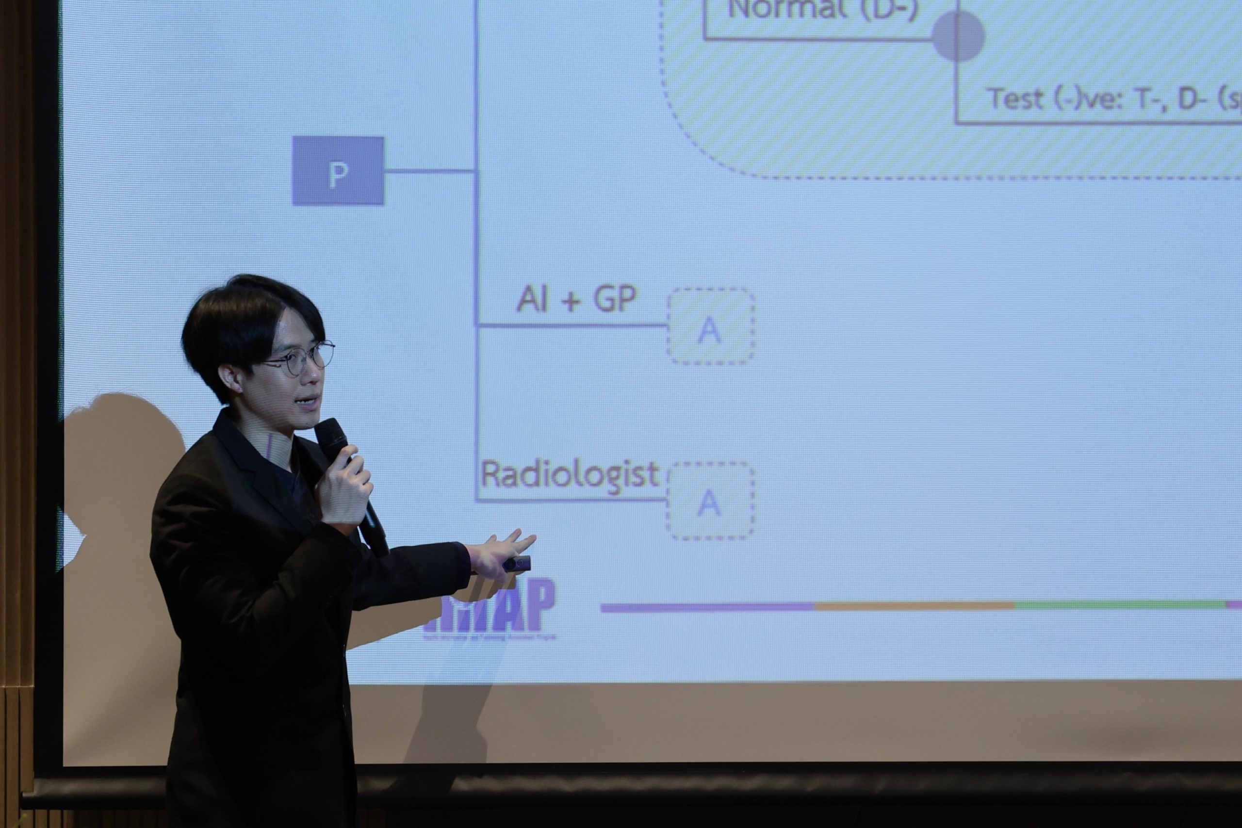 การบรรยายหัวข้อสุดท้าย นำเสนอโครงร่างการวิจัยเรื่อง “การประเมินความคุ้มค่าทางเศรษฐศาสตร์ของการใช้ปัญญาประดิษฐ์ช่วยคัดกรองวัณโรคปอดช่วยคัดกรองกลุ่มเสี่ยงตามชุมชน” เนื่องจาก ประเทศไทยในปัจจุบัน มีการใช้ปัญญาประดิษฐ์ช่วยอ่านภาพถ่ายรังสีปอดเพื่อช่วยคัดกรองวัณโรคในหลายพื้นที่ แม้ว่า องค์การอนามัยโลก (WHO) จะมคำแนะนำในการใช้ซอฟต์แวร์ช่วยอ่านภาพถ่ายรังสีปอดเพื่อการคัดกรองวัณโรคโดยไม่จำเป็นต้องมีการยืนยันโดยแพทย์ แต่ราชวิทยาลัยรังสีแพทย์แห่งประเทศไทย แนะนำไว้ชัดเจนว่า พึงหลีกเลี่ยงการใช้ผลการวิเคราะห์จากปัญญาประดิษฐ์ โดยปราศจากความเห็นของแพทย์ในทุกกรณี