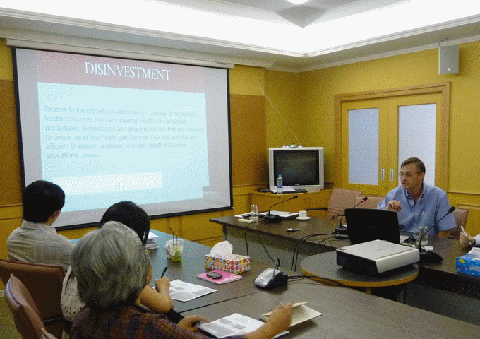 เมื่อวันที่ 15 กันยายน พ.ศ.2553 นักวิจัย HITAP จัด Journal Club ประจำเดือนกันยายน 2553 ณ ห้องประชุมใหญ่ HITAP ชั้น 6 อาคาร 6 กรมอนามัยในหัวข้อ “Health Technology Disinvestment” บรรยายโดย Thierry Defechereux, MD. จาก Johns Hopkins School of Public Health โดยได้รับเกียรติจาก นพ.สุรจิต สุนทรธรรม จากสำนักงานหลักประกันสุขภาพแห่งชาติเข้าร่วมฟังบรรยายในครั้งนี้ เนื้อหาในการประชุมกล่าวถึงกระบวนการเพิกถอนเทคโนโลยีด้านสุขภาพไม่ว่าจะเป็นเครื่องมือแพทย์หรือยาที่ถูกประเมินแล้วว่าหากนำไปใช้จะไม่เกิดความคุ้มค่าต่อระบบบริการทางสุขภาพ