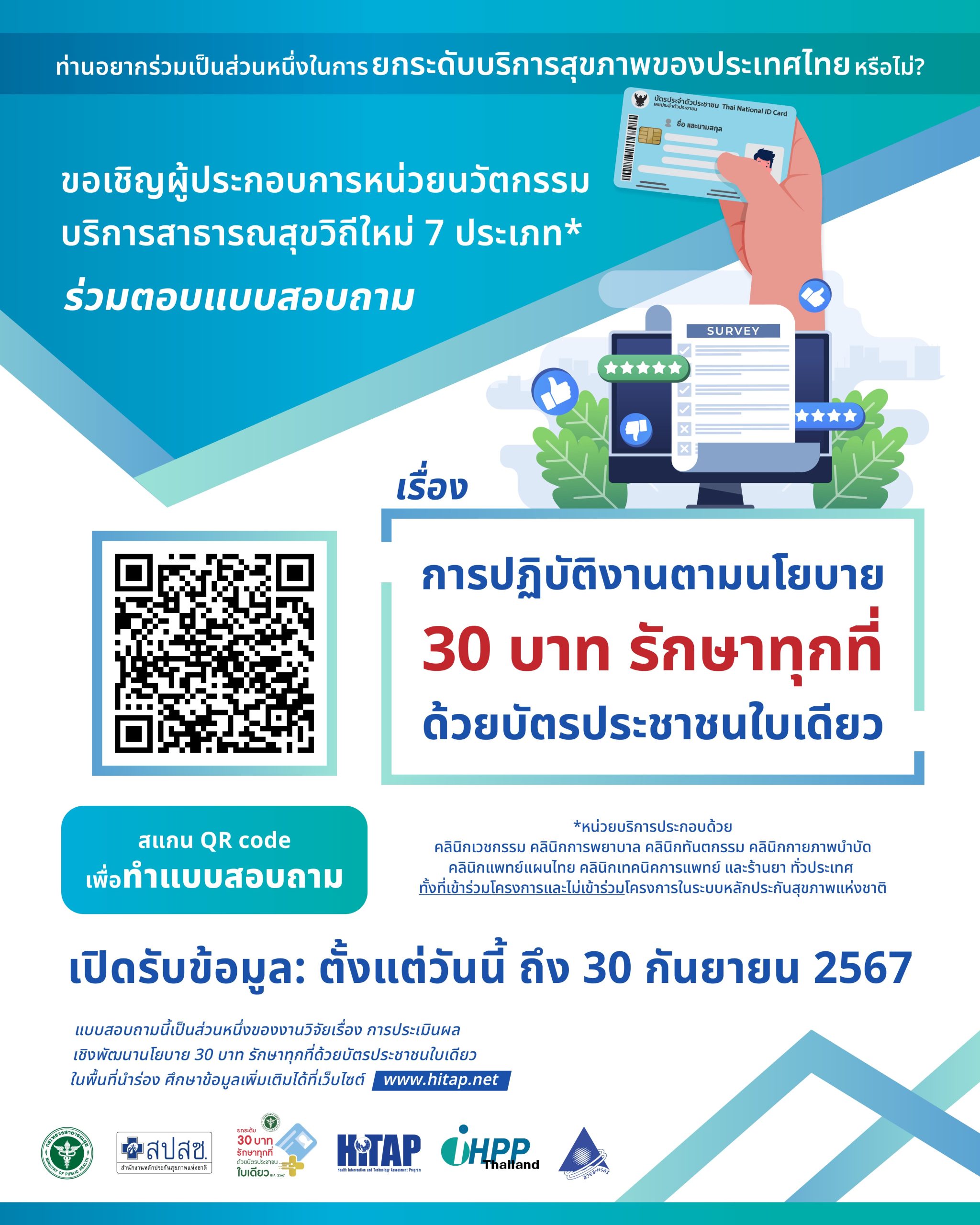 ร่วมตอบแบบสอบถามหัวข้อ “การปฏิบัติงานตามนโยบาย 30 บาทรักษาทุกที่ ด้วยบัตรประชาชนใบเดียว” เพื่อที่ท่านได้ร่วมเป็นส่วนสำคัญในการยกระดับบริการสุขภาพของประเทศไทย เปิดรับแบบสอบถามตั้งแต่วันนี้ – 30 กันยายน 2567 นี้เท่านั้น!