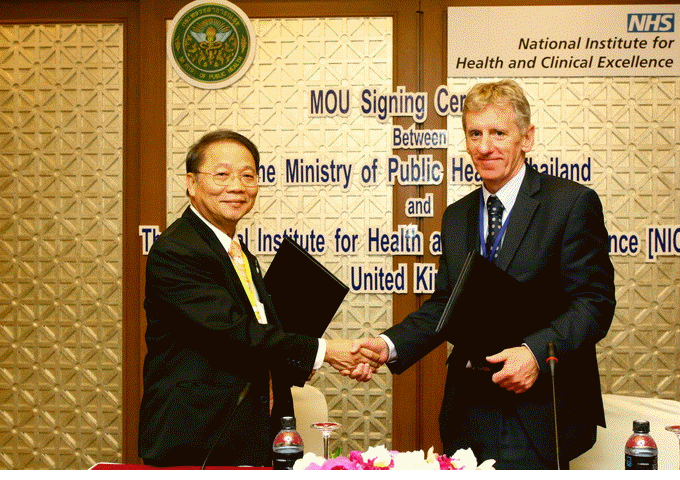 พิธีลงนามบันทึกความเข้าใจ (Memorandum of understanding) ว่าด้วยความร่วมมือในการประเมินเทคโนโลยีด้านสุขภาพระหว่างนายแพทย์ศิริวัฒน์ ทิพย์ธาราดล รองปลัดกระทรวงสาธารณสุขกับ Sir Andrew Dillon ประธานเจ้าหน้าที่บริหาร (Chief Executive Officer) ของ NICE จากข้อตกลงดังกล่าว กระทรวงสาธารณสุขโดยโครงการประเมินเทคโนโลยีด้านสุขภาพ (Health Intervention and Technology Assessment Program, HITAP) และหน่วยงานด้านวิเทศสัมพันธ์ของ NICE (NICE International) จะแลกเปลี่ยนความรู้ ประสบการณ์และนักวิจัย ร่วมกันพัฒนาระเบียบวิธีวิจัยและแนวปฏิบัติในการประเมินเทคโนโลยีด้านสุขภาพในมิติต่างๆ รวมทั้งดำเนินโครงการให้ความช่วยเหลือด้านวิชาการแก่ประเทศกำลังพัฒนาอื่นๆ ที่สนใจด้านการประเมินเทคโนโลยีด้านสุขภาพและการนำไปใช้เชิงนโยบาย ตลอดระยะเวลา 3 ปีภายใต้ข้อตกลงนี้ นักวิจัยของกระทรวงสาธารณสุขจะได้รับการพัฒนาเสริมสร้างศักยภาพทั้งด้านวิชาการและการบริหารจัดการเพื่อให้การศึกษาวิจัยเพื่อการประเมินเทคโนโลยีและมาตรการด้านสุขภาพมีคุณภาพน่าเชื่อถือ และเกิดประโยชน์สูงสุดต่อระบบสุขภาพไทย